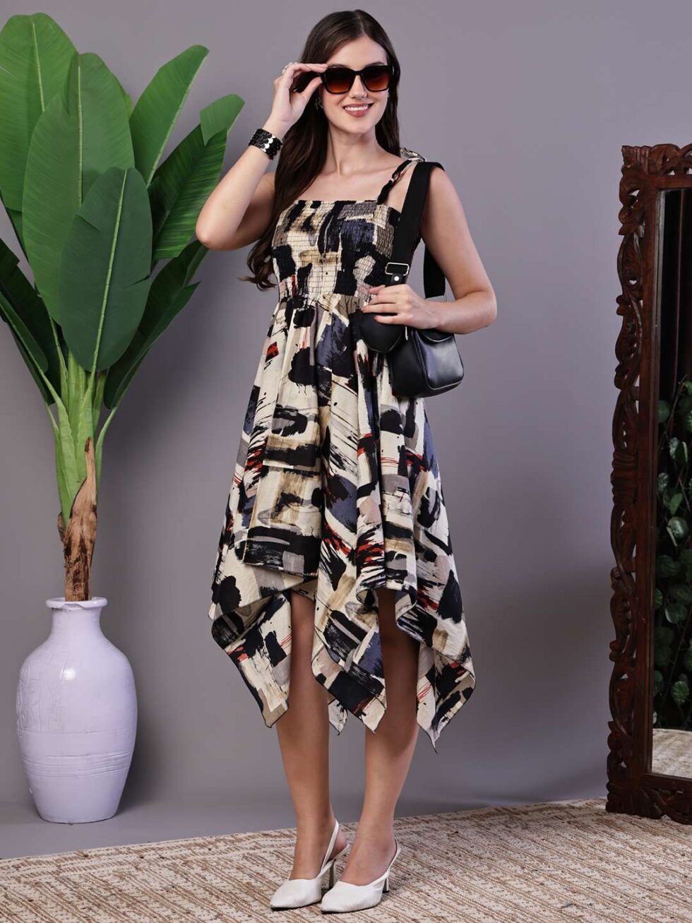 Effortlessly stylish dress with a vibrant abstract print, tie-up shoulder straps, and a chic high-low handkerchief hemline ? perfect for casual days or evening gatherings.